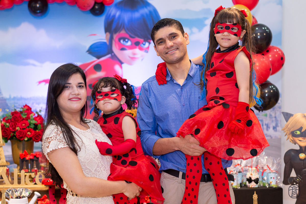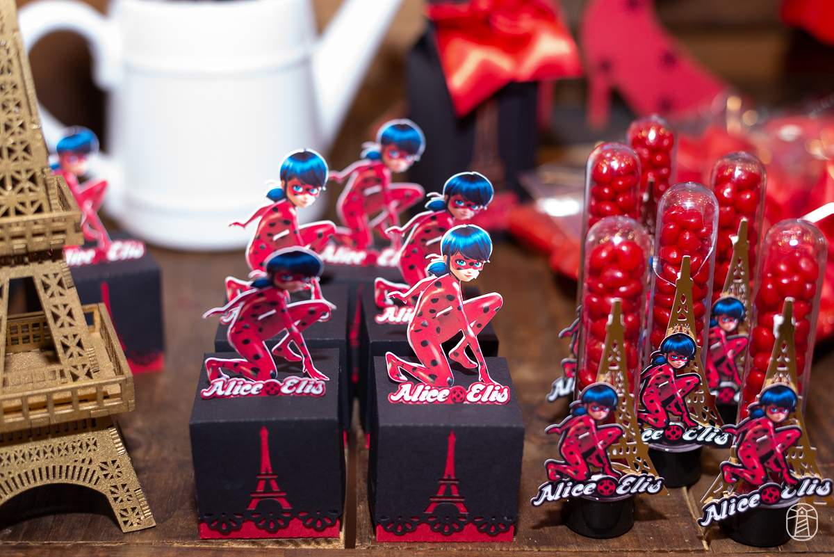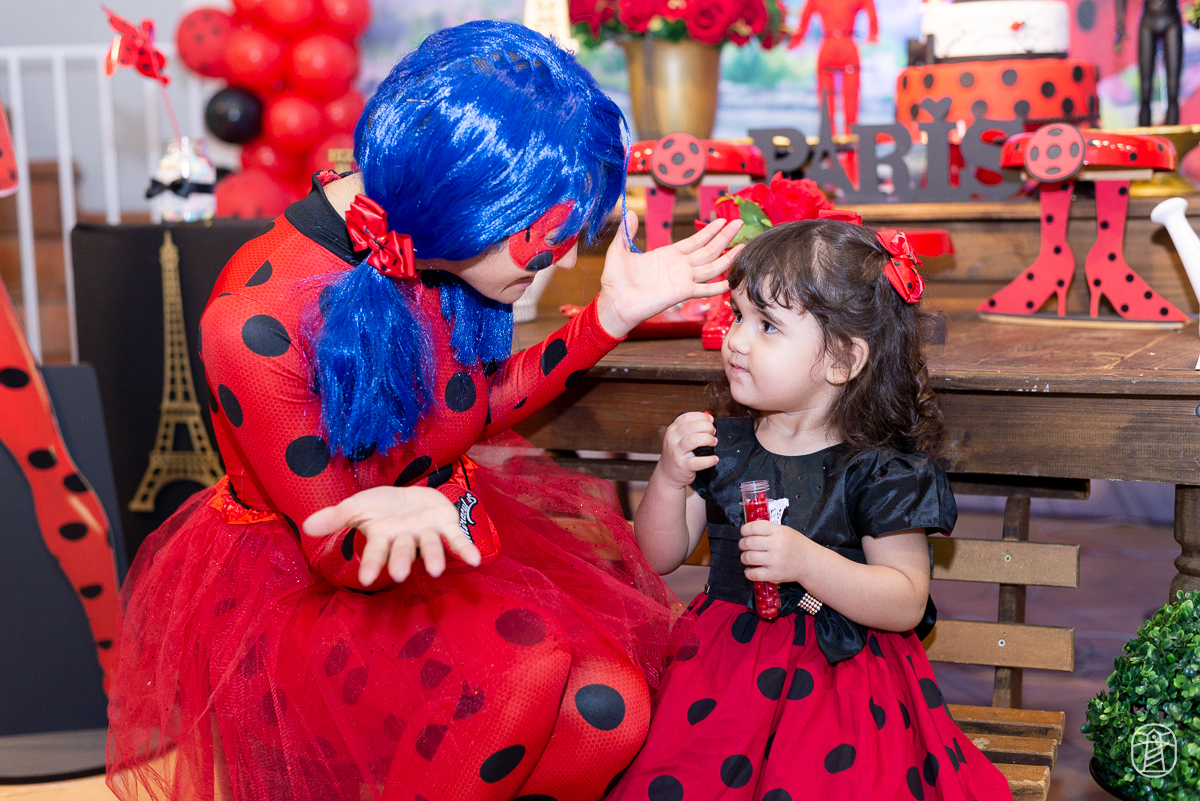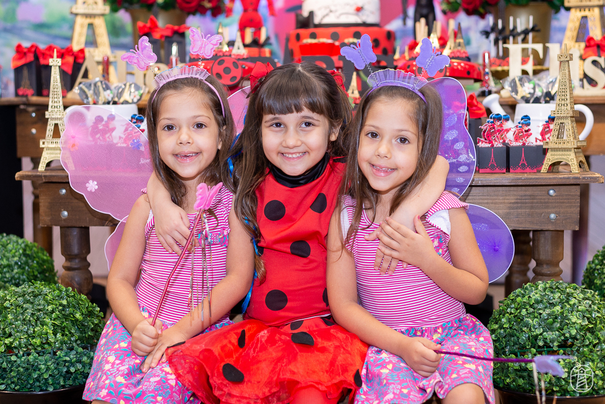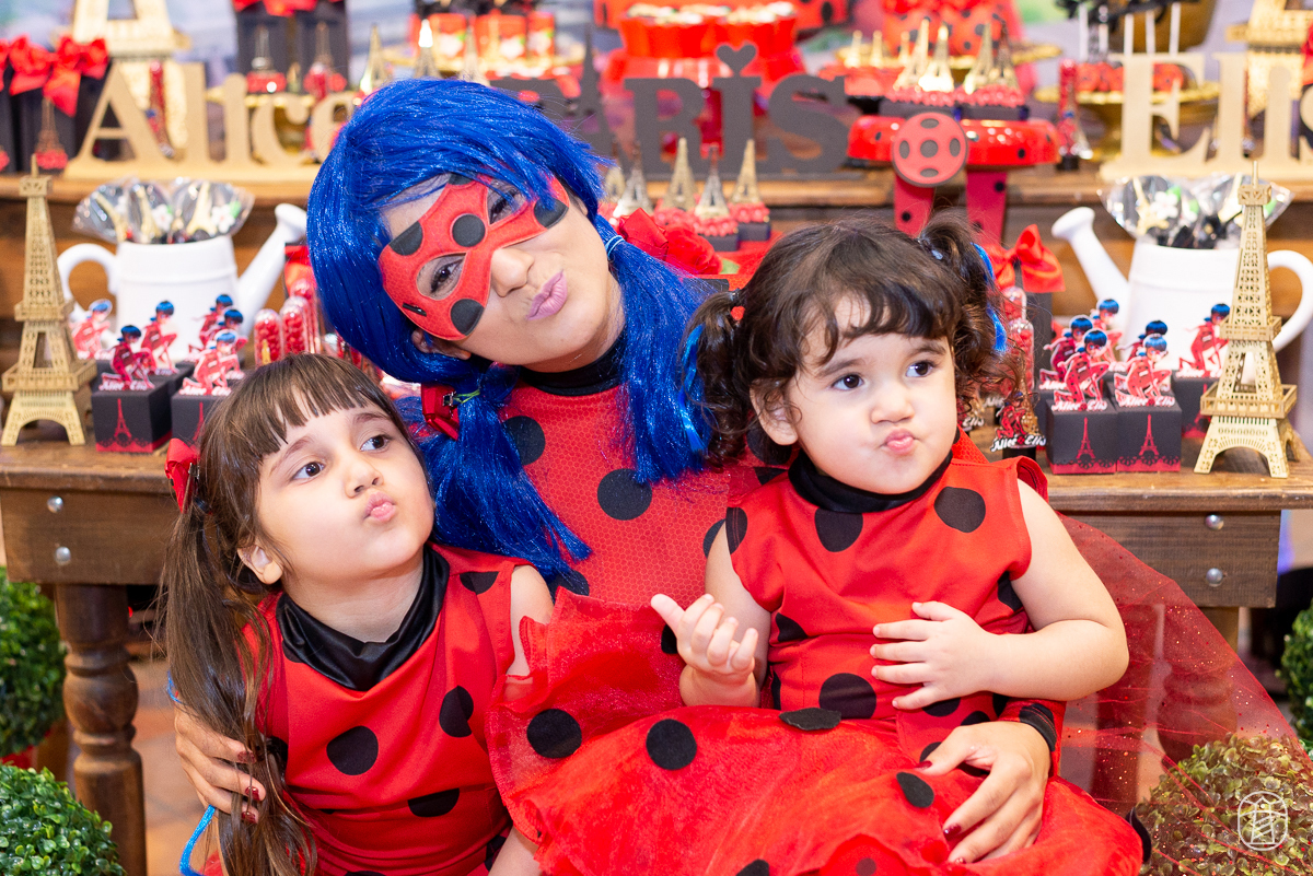 Diretamente de Paris, a heroína Ladybug foi a convidada especial na festa das irmãs Elis e Alice.